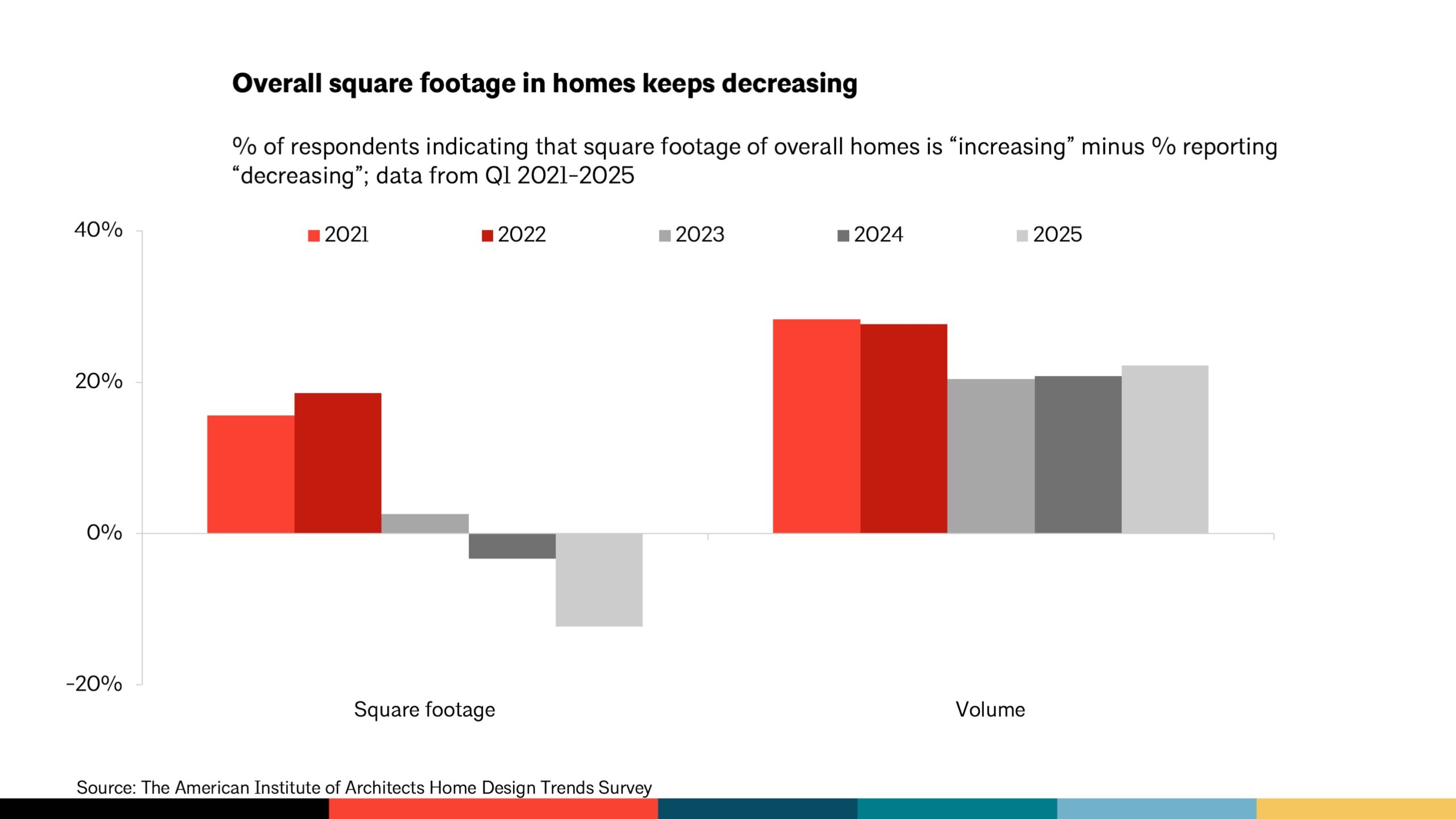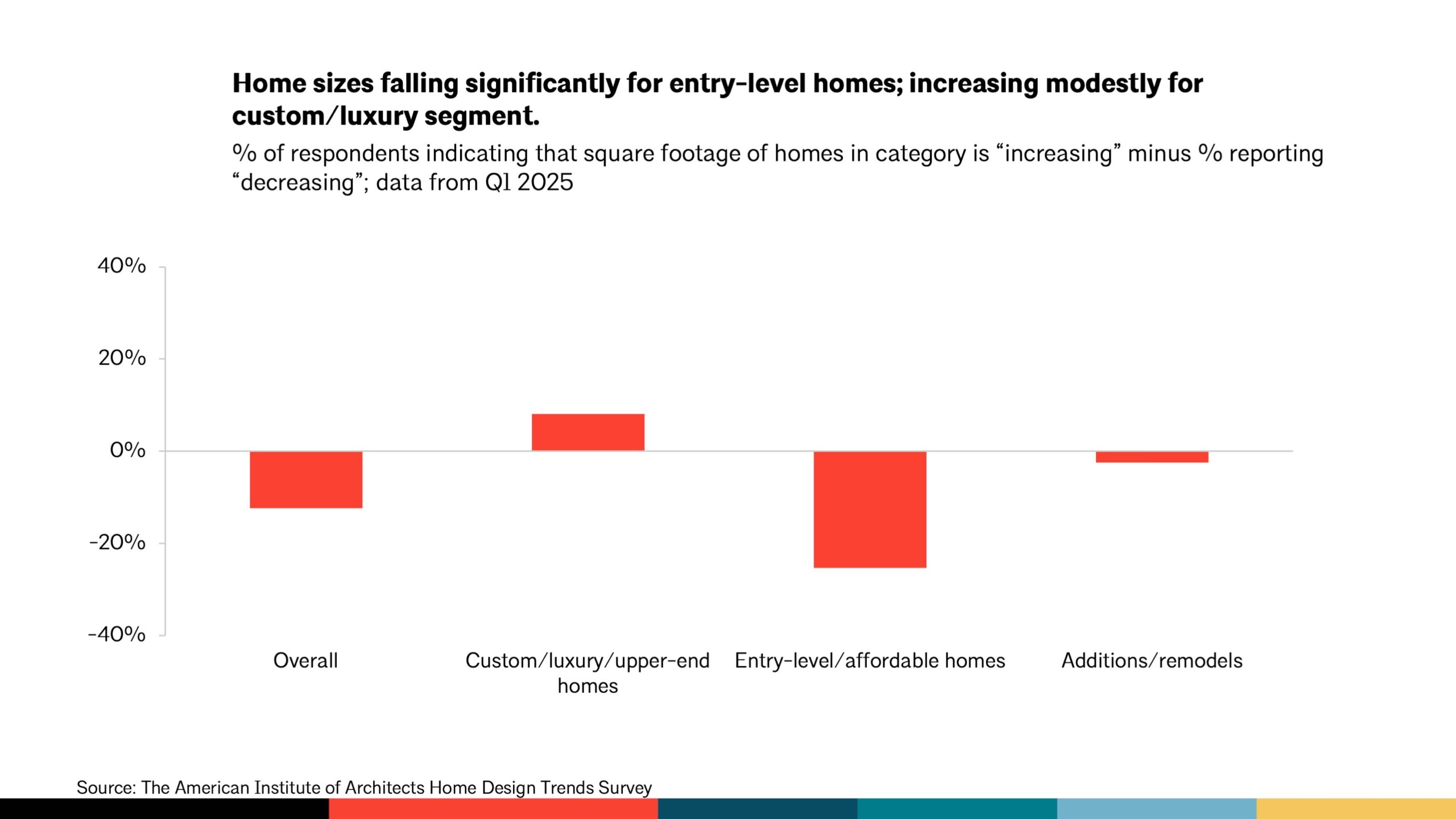The survey results paint a split-screen picture. Entry-level and affordable homes continue to shrink, with 25% of architects reporting smaller floor plans in this category. In contrast, custom and luxury homes saw a modest increase in size, with 8% of architects noting growth.