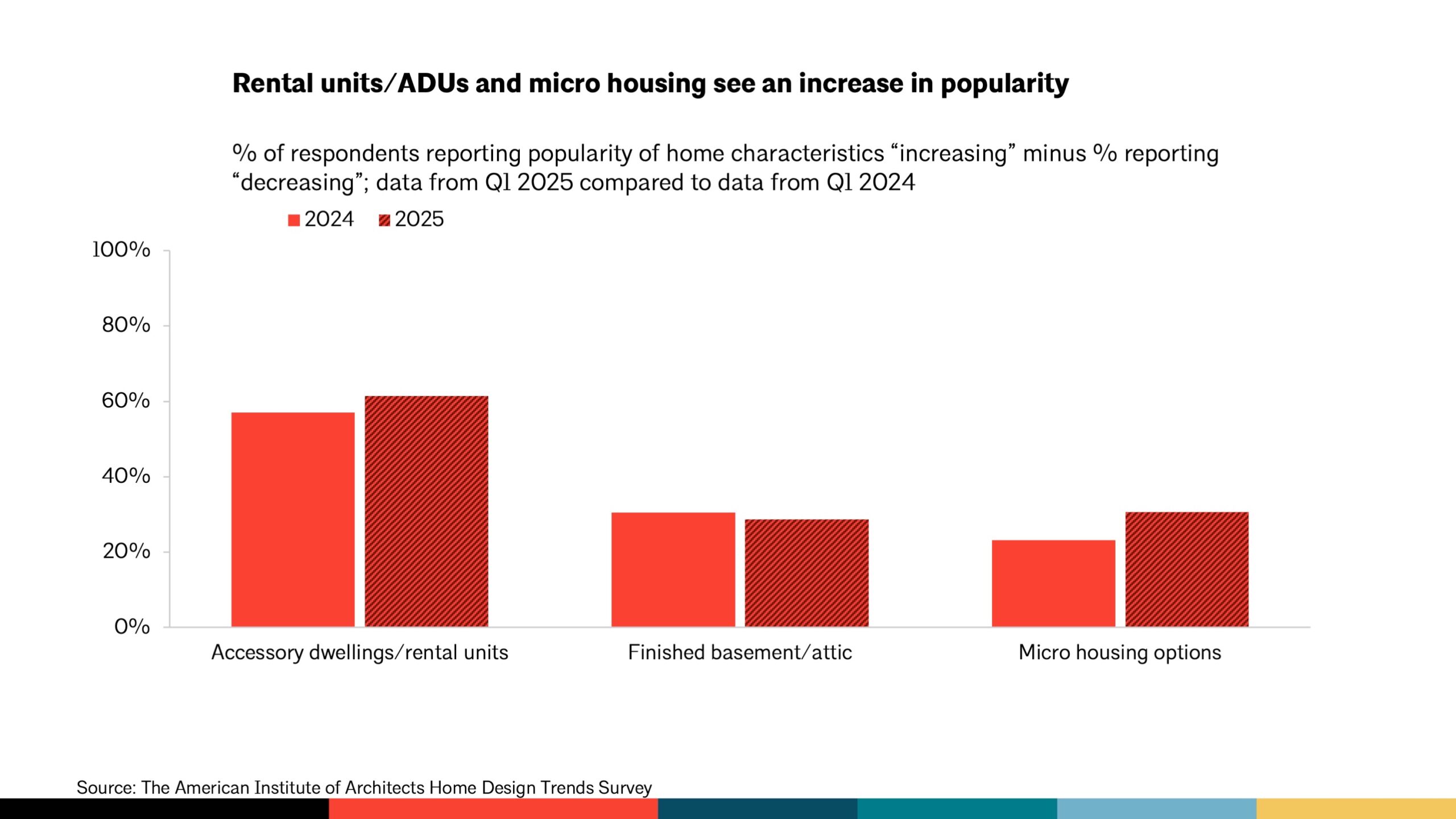 Not all the news is about loss—some of it’s about opportunity. Accessory Dwelling Units (ADUs) and rental units are more popular than ever, rising from 57% to 62% of architect reports in just one year. Micro housing options have also climbed, now showing up in 31% of projects.