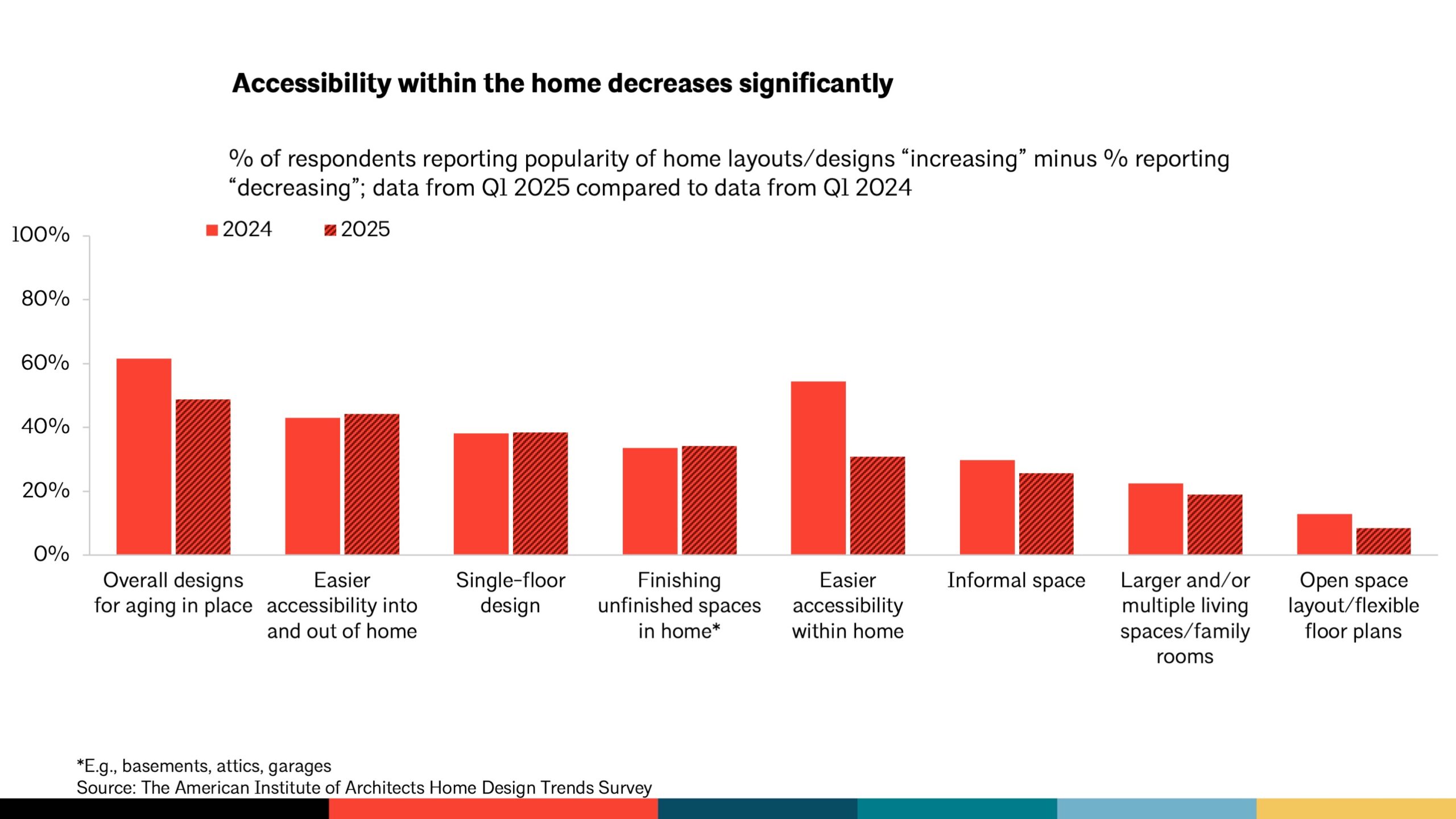 The exception? Easier access into and out of the home and single-floor layouts saw slight increases, suggesting that while full accessibility isn’t always prioritized, basic ease of movement is still on homeowners’ minds.