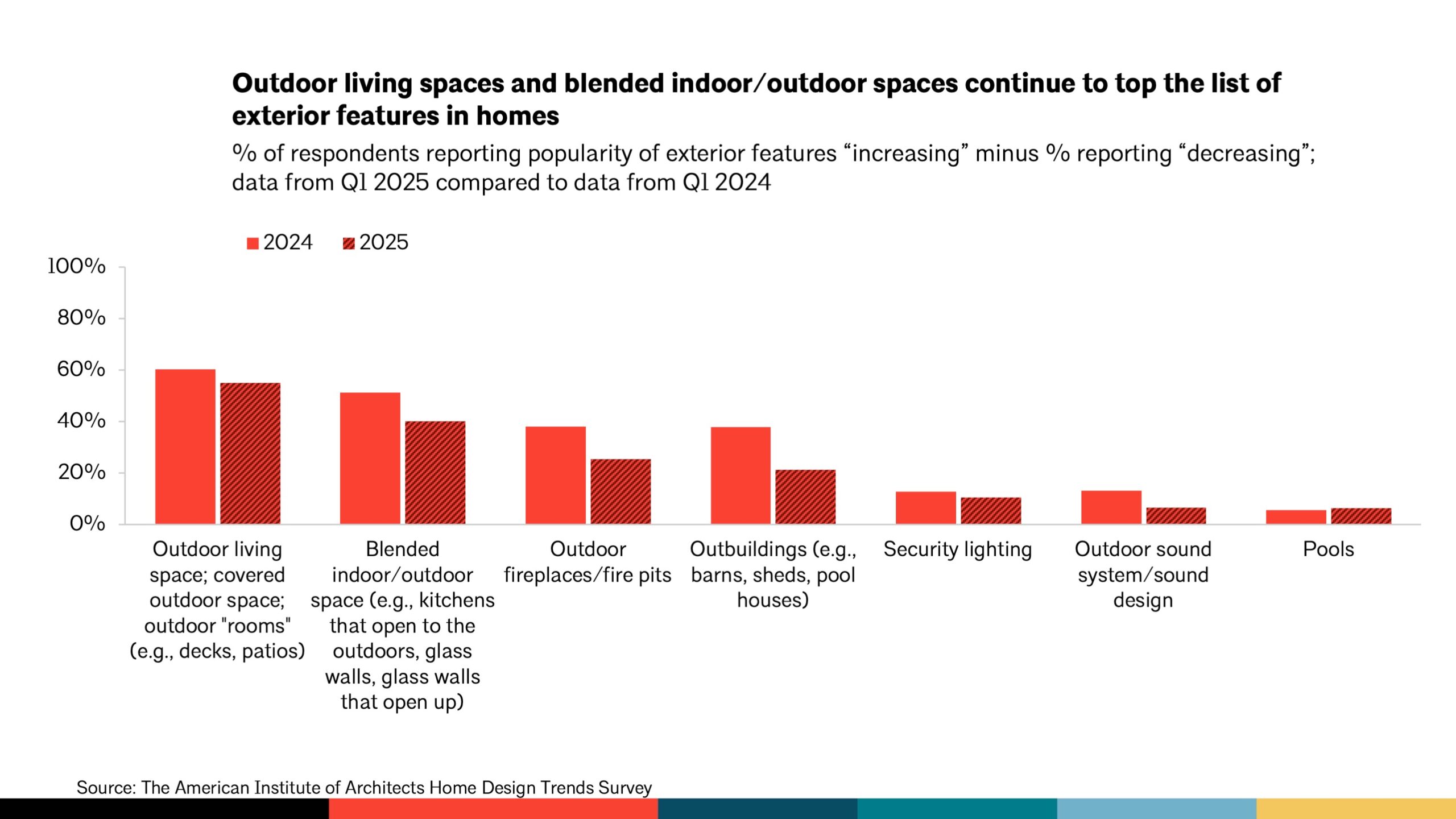 Fire features like fireplaces and fire pits fell dramatically, from 38% to 21%, possibly influenced by wildfire concerns in certain regions. Other outdoor amenities such as sheds, barns, and pool houses also dipped, reflecting the current economic squeeze.
